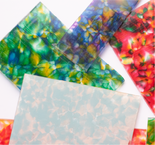 板材の透明感や色の重なりを生かすため、何度も試作と調整を重ねました。偶然と意図、その間から生まれる表情に、あなたの“好き”に添えて。
